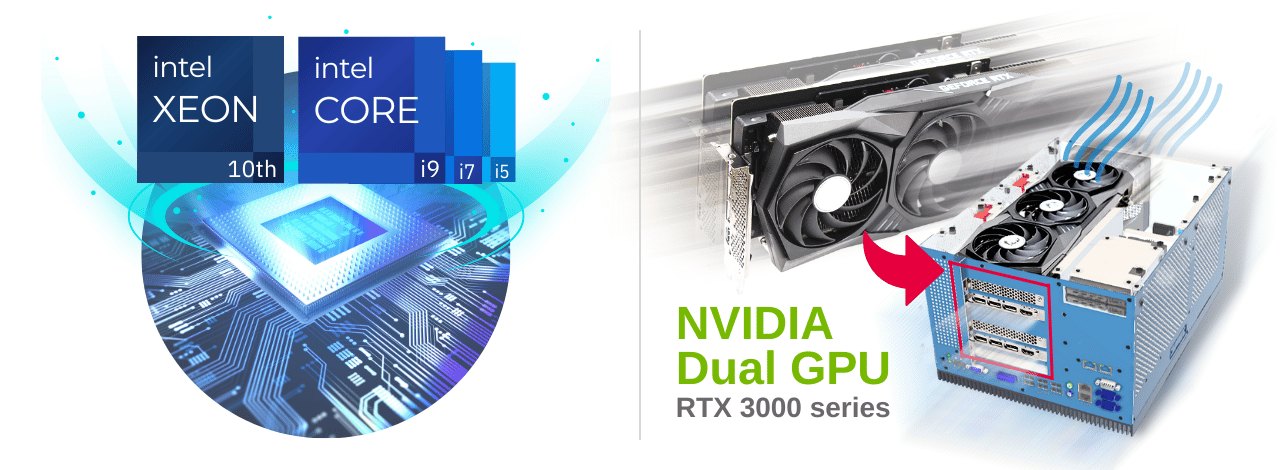 | •10th Comet lake, Could support 10-core 10th Gen Intel® Xeon CPU | • GPU support, Could Supports dual NVIDIA RTX 3000 series graphics cards (Max.320W/Each) | |||